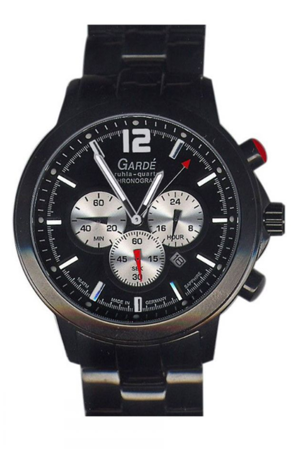 schwarzes Zifferblatt mit silbernen Zahlen/Indices