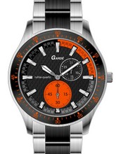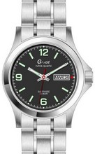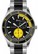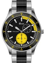 Gehäuse Stahl satiniert,Lünette schwarz Druck gelb,